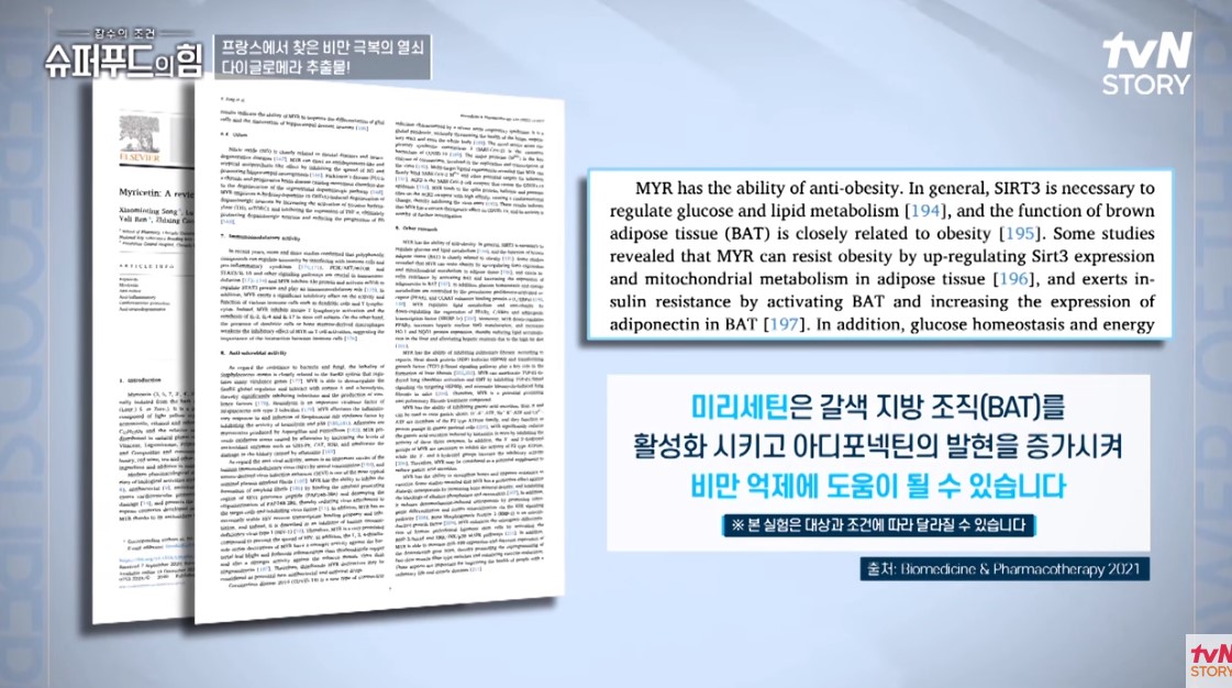미리세틴은 지방을 태우는 갈색지방 조직을 활성화시키고 지방 분해 호르몬인 아디포넥의 발현을 증가시켜 비만 합성 억제에 도움을 줄 수 있는 것으로 알려졌습니다.